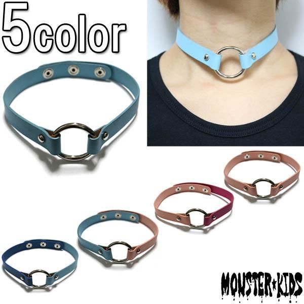 パステルカラーフロントリングレザーゴシックパンクチョーカー【サークルリング/ボタン留め】